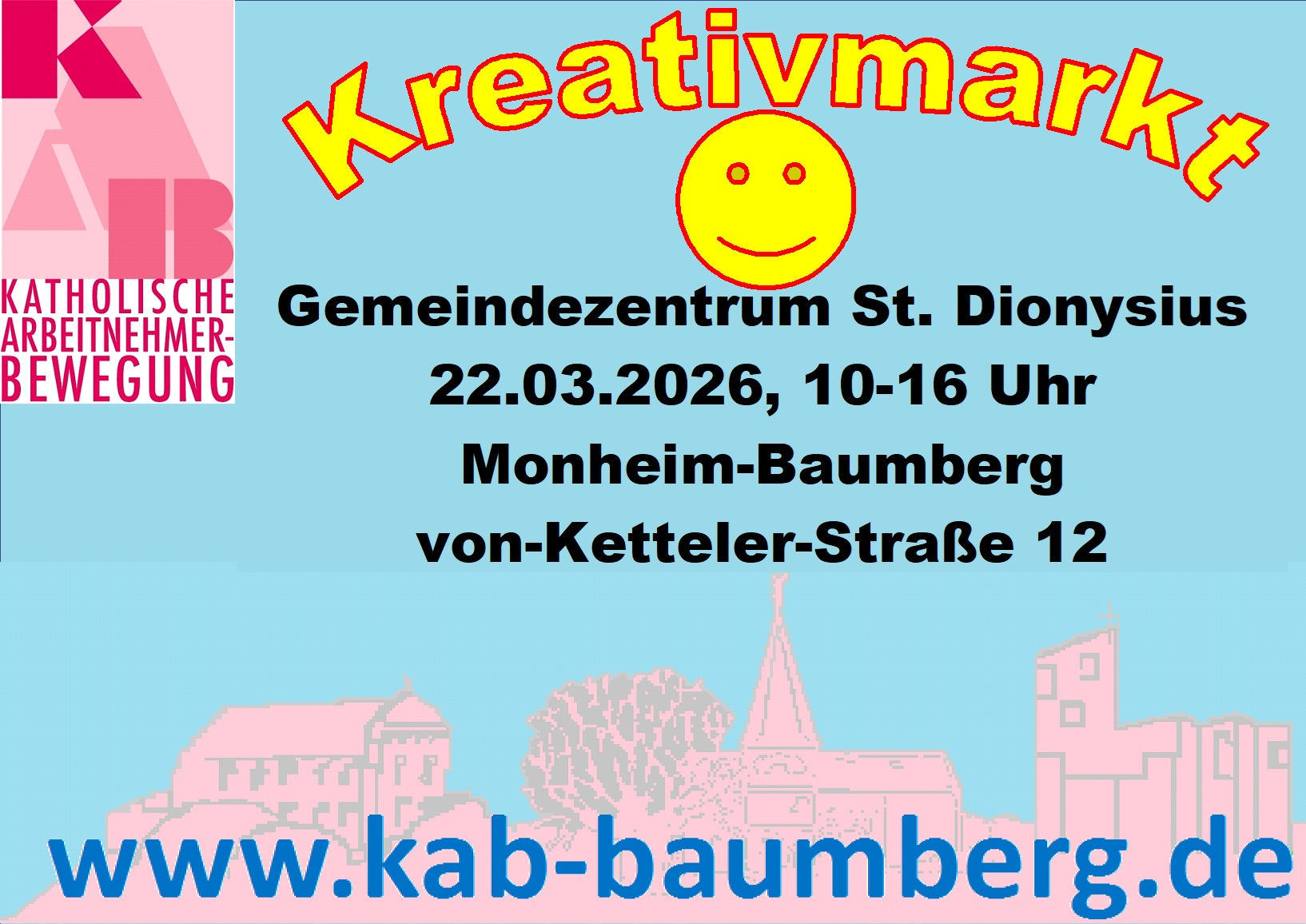 Die Katholische Arbeitnehmer-Bewegung St. Dionysius Baumberg e.V. lädt zu ihrem 9. Kreativmarkt ein.